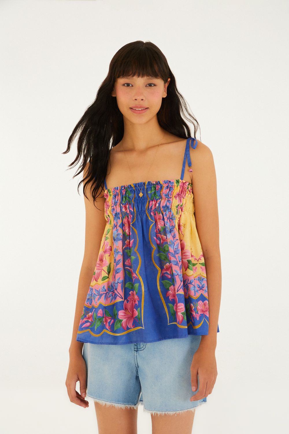 blusa lastex estampada lena. com alças finas ajustáveis e decote reto, esta blusa traz um toque casual e despojado ao seu guarda-roupa. sua modelagem solta e o detalhe em lastex no busto garantem conforto e estilo. perfeita para passeios ao ar livre ou aquele almoço especial. FARM RIO original - alto verão 26.-