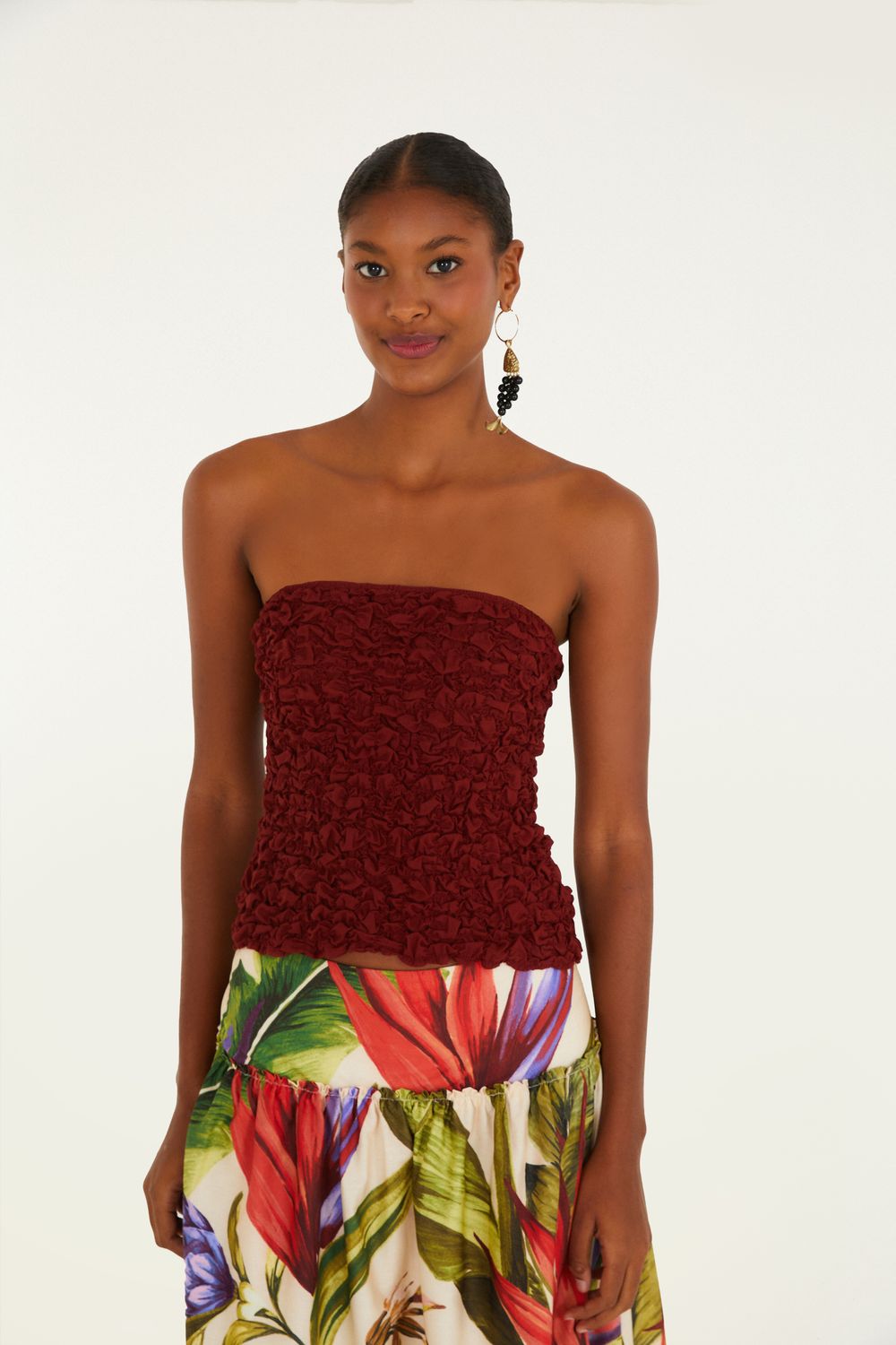 blusa lastex sem alça. com design que valoriza os ombros, o modelo sem alças é versátil e sofisticado. o lastex envolve o corpo de forma confortável, proporcionando ajuste perfeito. perfeita para compor looks casuais ou para uma saída à noite. peça coringa que transforma qualquer visual. FARM RIO original - verão 26.