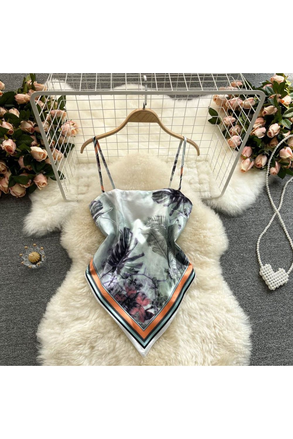 Blusa lenço amarração costas assimétrica estampada verde - U