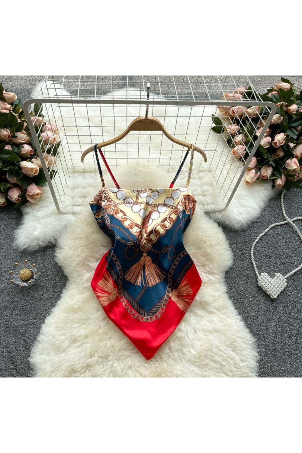 Blusa lenço amarração costas assimétrica estampada vermelhae azul