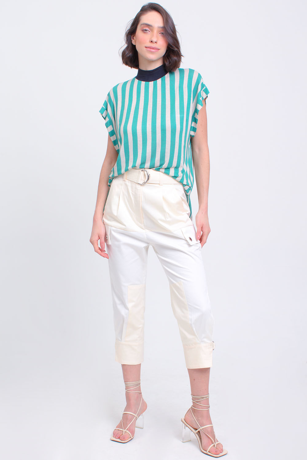 Blusa animale modelo blusas, gola alta, estampado listrado, cor branco, verde, manga curta, tecido elastano e linho e viscose. *as peças podem variar a estampa de acordo com o corte.