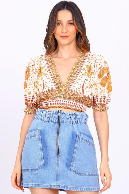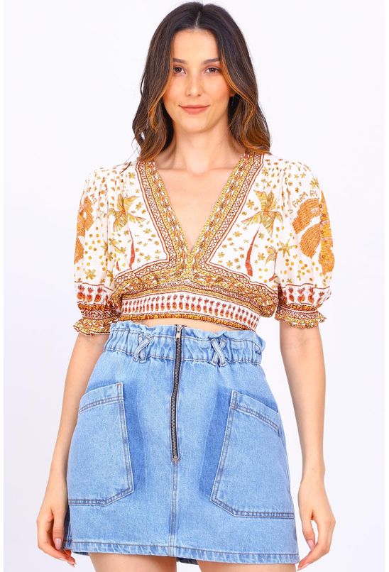 Blusa farm com estampa exclusiva da marca possui mangas curtas bufantes finalizadas em elástico, decote em V, comprimento cropped e lastex na cintura.