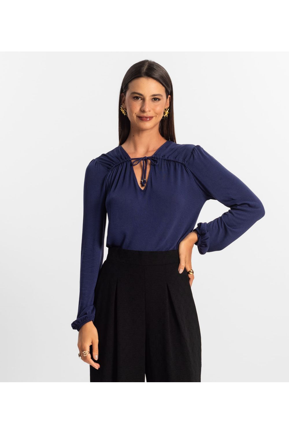 A Blusa Feminina Rovitex, feita em Visco Tricot, combina sofisticação e leveza em um design delicado. Possui decote em V, que valoriza o colo, e franzido no ombro e na cava, adicionando charme e fluidez à peça. O diferencial fica por conta do túnel para passar rolotê, permitindo uma amarração frontal, ideal para ajustar o caimento conforme o estilo desejado. A manga ampla com acabamento em elástico proporciona conforto e um toque elegante, tornando essa blusa perfeita para composições modernas.-