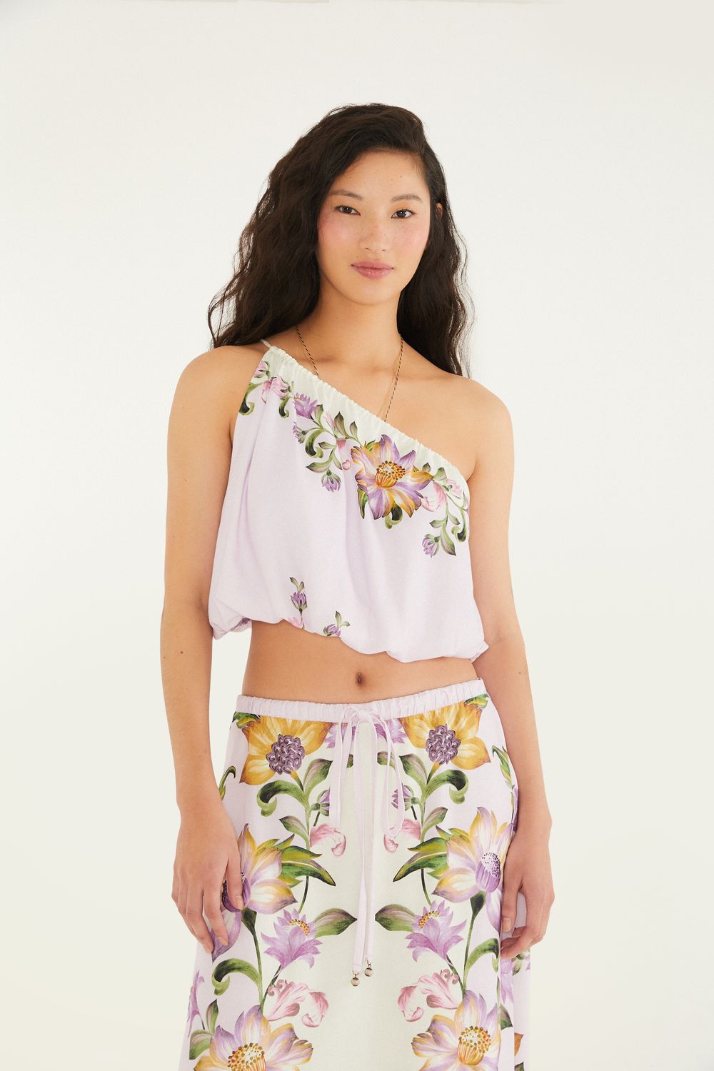 blusa ombro só estampada laura traz a leveza e a originalidade em um só modelo. com corte assimétrico e ombro à mostra, possui detalhes de alças delicadas e barrado solto, proporcionando um caimento fluido. ideal para eventos casuais e momentos de lazer. FARM RIO original - alto verão 26.-
