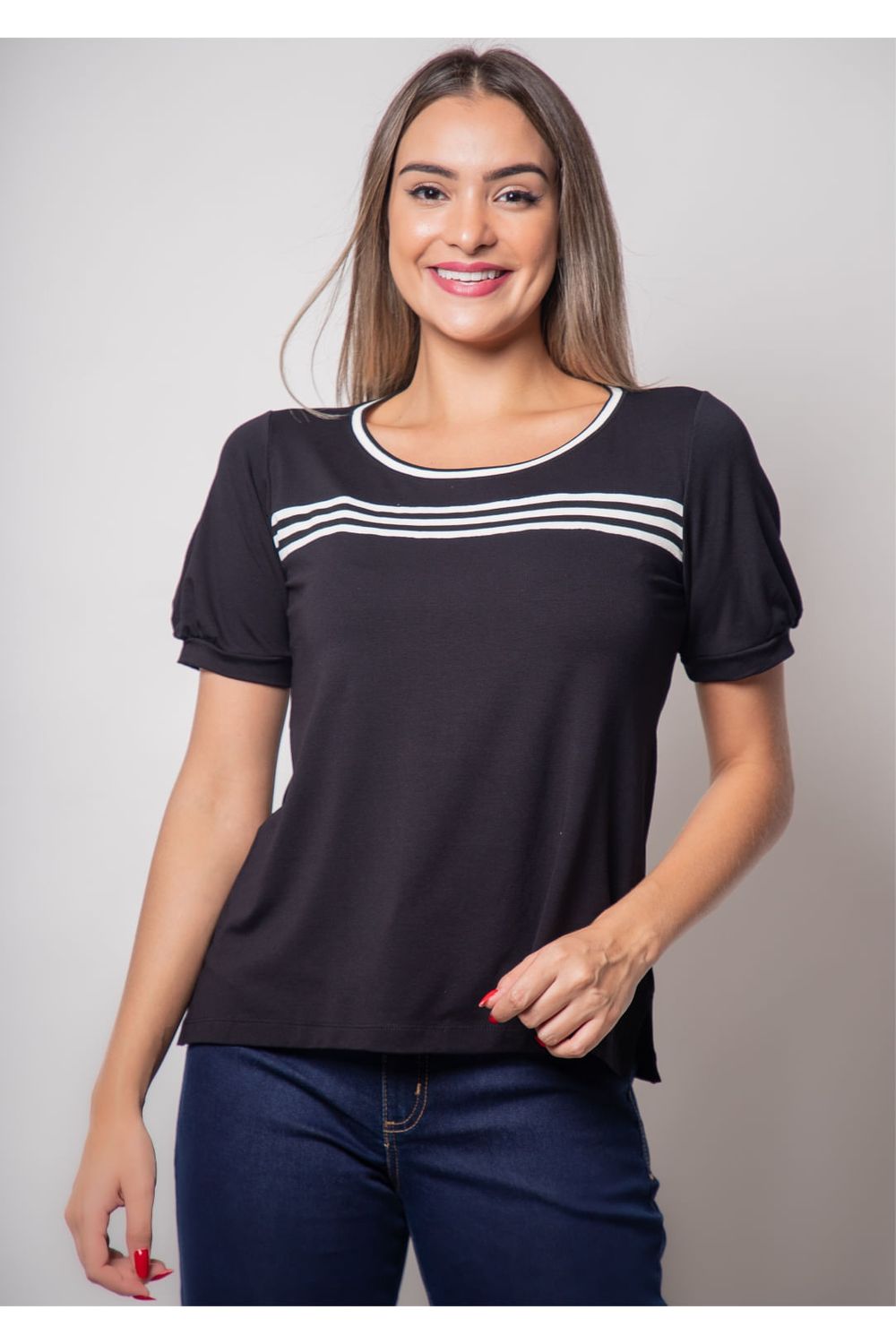 Mangas curtas - estilo "princesa", e decote redondo com acabamento listrado.
