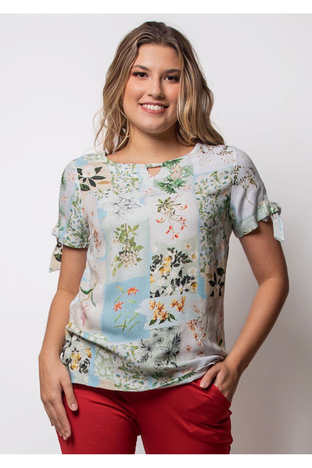 Malha da blusa estampada, em tons de Azul, Bege e Verde.