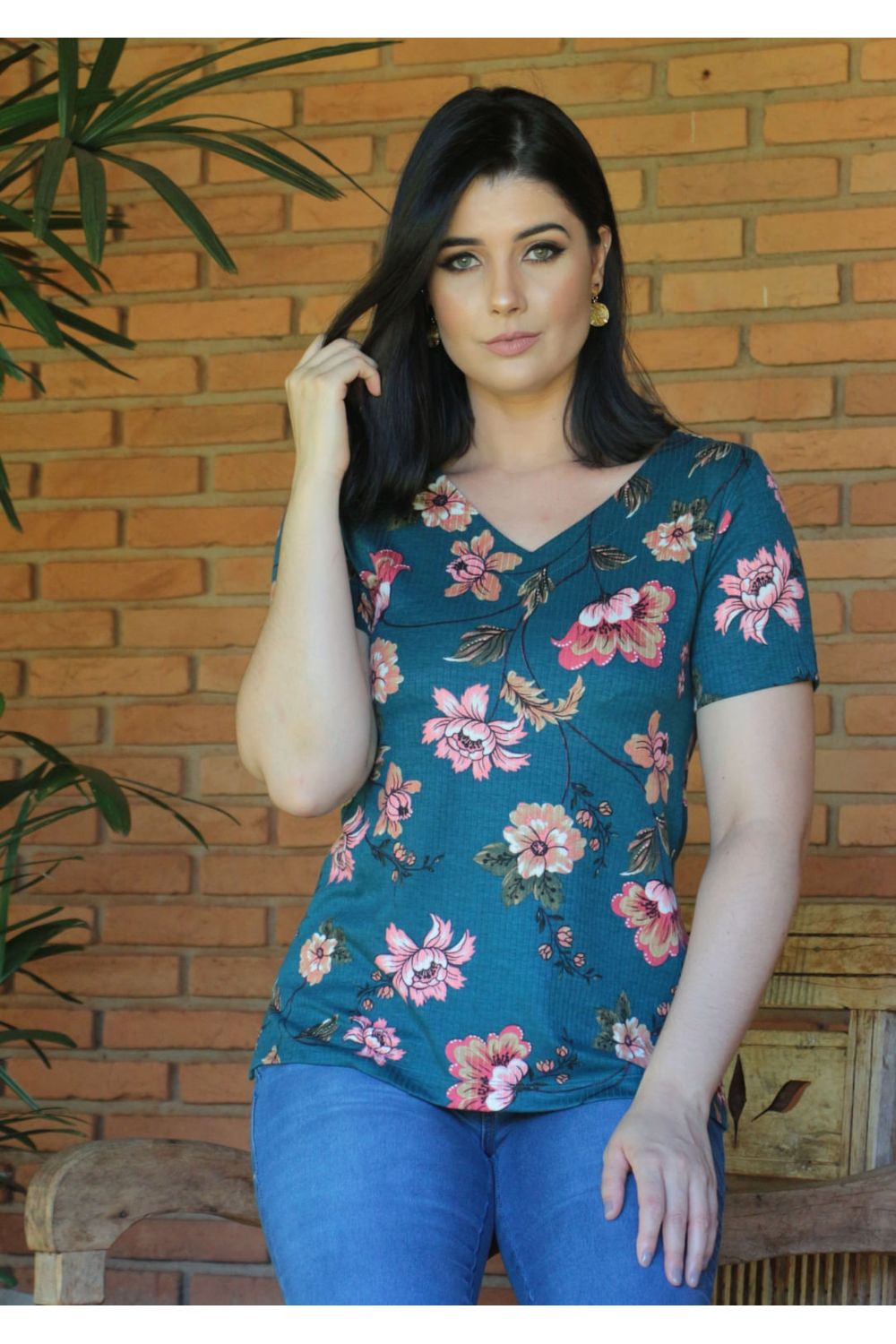 Blusa estampada com fundo Azul Petróleo .