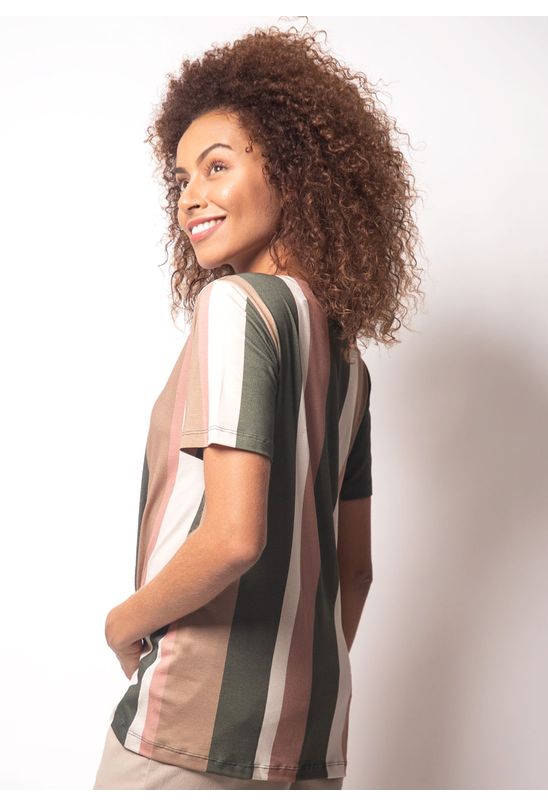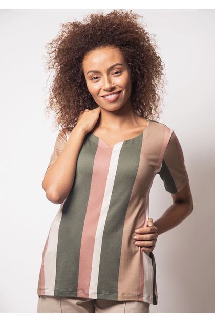 Blusa Listrada em tons de Verde, Bege e Rosê.
