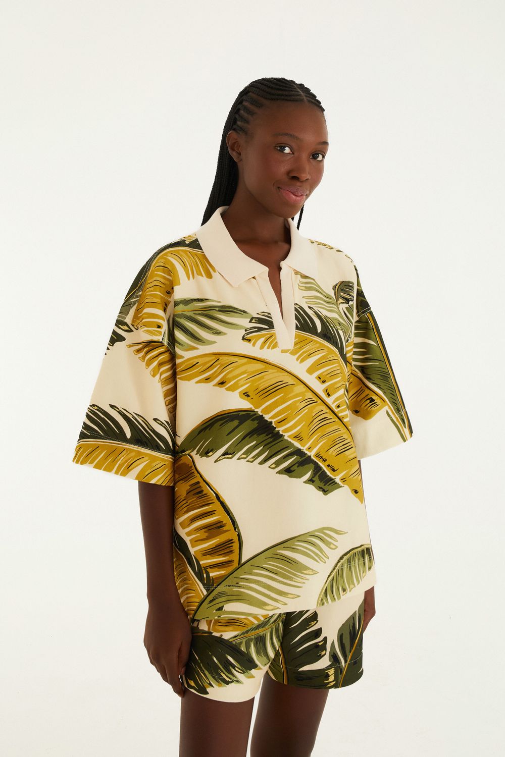 blusa polo moletom estampada trancoso. com um corte moderno e mangas amplas, é ideal para ocasiões casuais, trazendo conforto e estilo. o tecido é leve e a gola polo com botões sutis adiciona um toque especial à peça. perfeita para um passeio descontraído ou um encontro. FARM RIO original - verão 26.-
