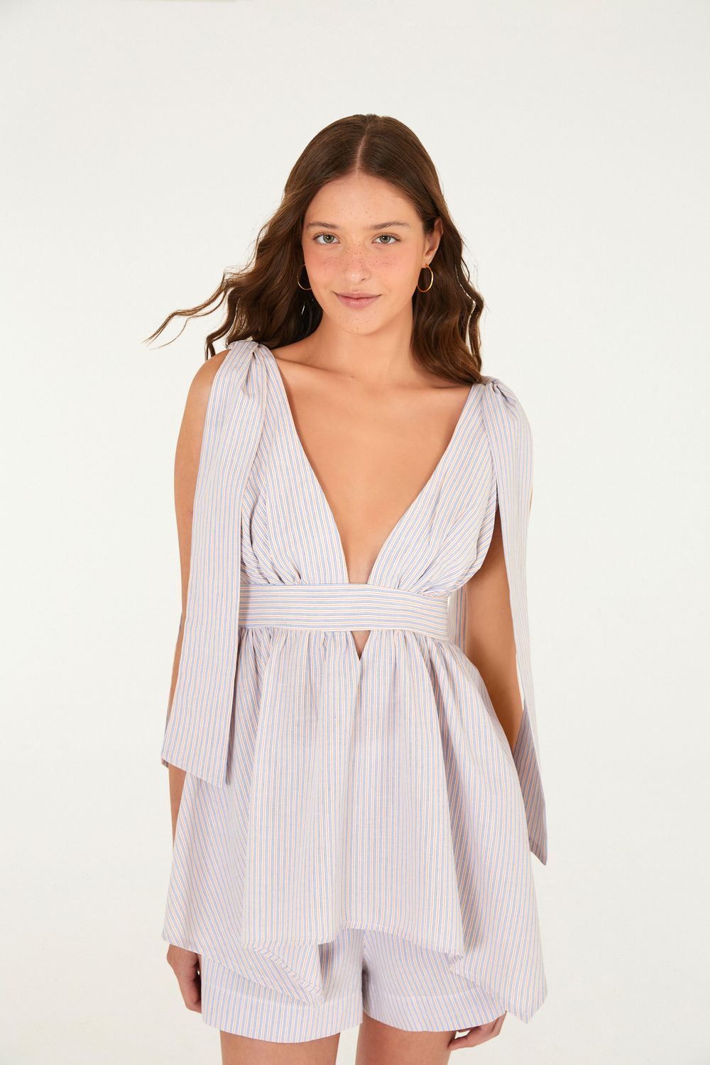 blusa pontas listra laranja é uma peça única, com recorte assimétrico e um design envolvente. seu decote profundo em v e as alças largas dão um toque especial, perfeito para ocasiões casuais ou uma tarde de verão. o detalhe das listras eleva ainda mais a originalidade deste modelo. FARM Rio, coleção Carioca - inverno 26.-