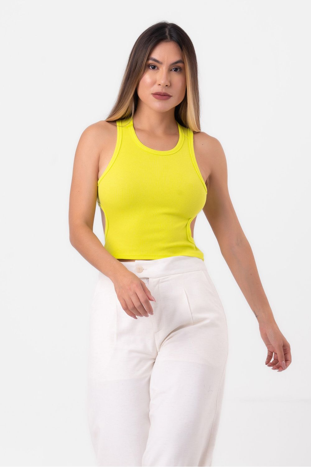 Blusa regata detalhe vazado verde fluorescente pequiá