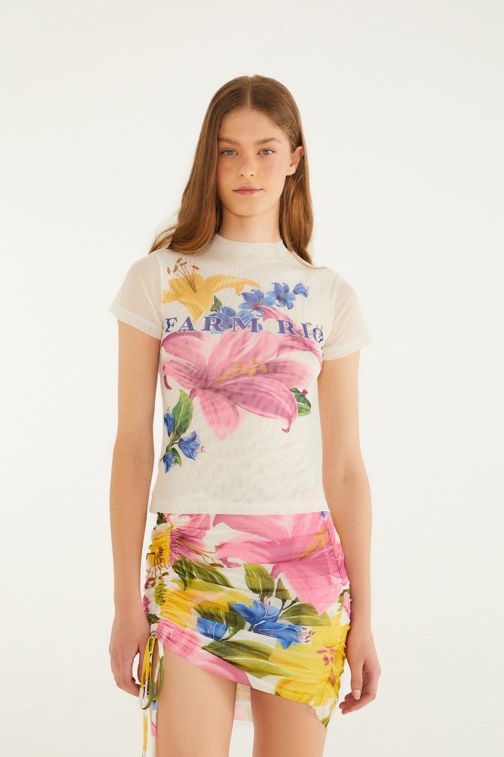 blusa tule estampada floral malu. confeccionada em tule leve e suave, possui estampas florais que trazem frescor e originalidade. o corte ajustado e as mangas curtas realçam a peça, enquanto o decote redondo proporciona um toque casual perfeito para dias ensolarados. ideal para combinar com saias ou calças fluidas, é aquela escolha certeira para um passeio ao ar livre. FARM RIO original - alto verão 26.-