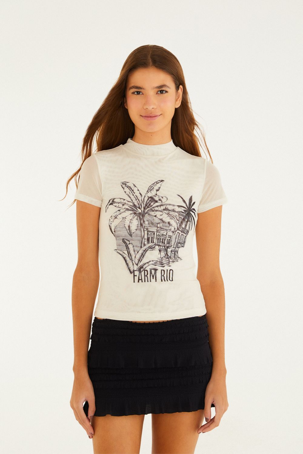 blusa tule vila teresa. com gola alta que adiciona um toque moderno, esta peça tem mangas curtas que proporcionam leveza e frescor. o tule revela um visual despojado e contemporâneo, ideal para um look casual ou para eventos descontraídos. perfeita para quem busca estilo autêntico no dia a dia. FARM Rio, coleção Carioca - inverno 26.-