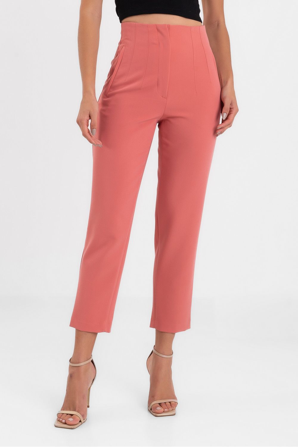 Esta sofisticada calça na cor coral em alfaiataria é uma peça que combina estilo e conforto. Com uma modelagem reta que proporciona uma silhueta elegante, a cintura alta adiciona um toque moderno e favorecedor.