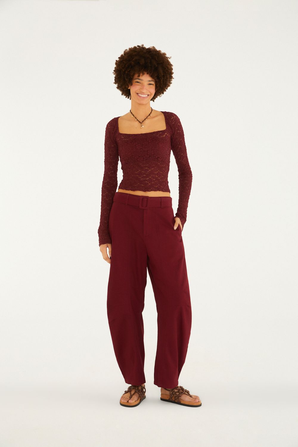 calça ballon. com cintura alta e modelagem ampla, esta calça oferece um toque contemporâneo ao visual. as pregas na frente trazem um charme extra, enquanto o fechamento com zíper e botão garante praticidade. perfeita para compor looks casuais ou elegantes, proporcionando versatilidade no dia a dia. FARM Rio, coleção Carioca - inverno 26.
