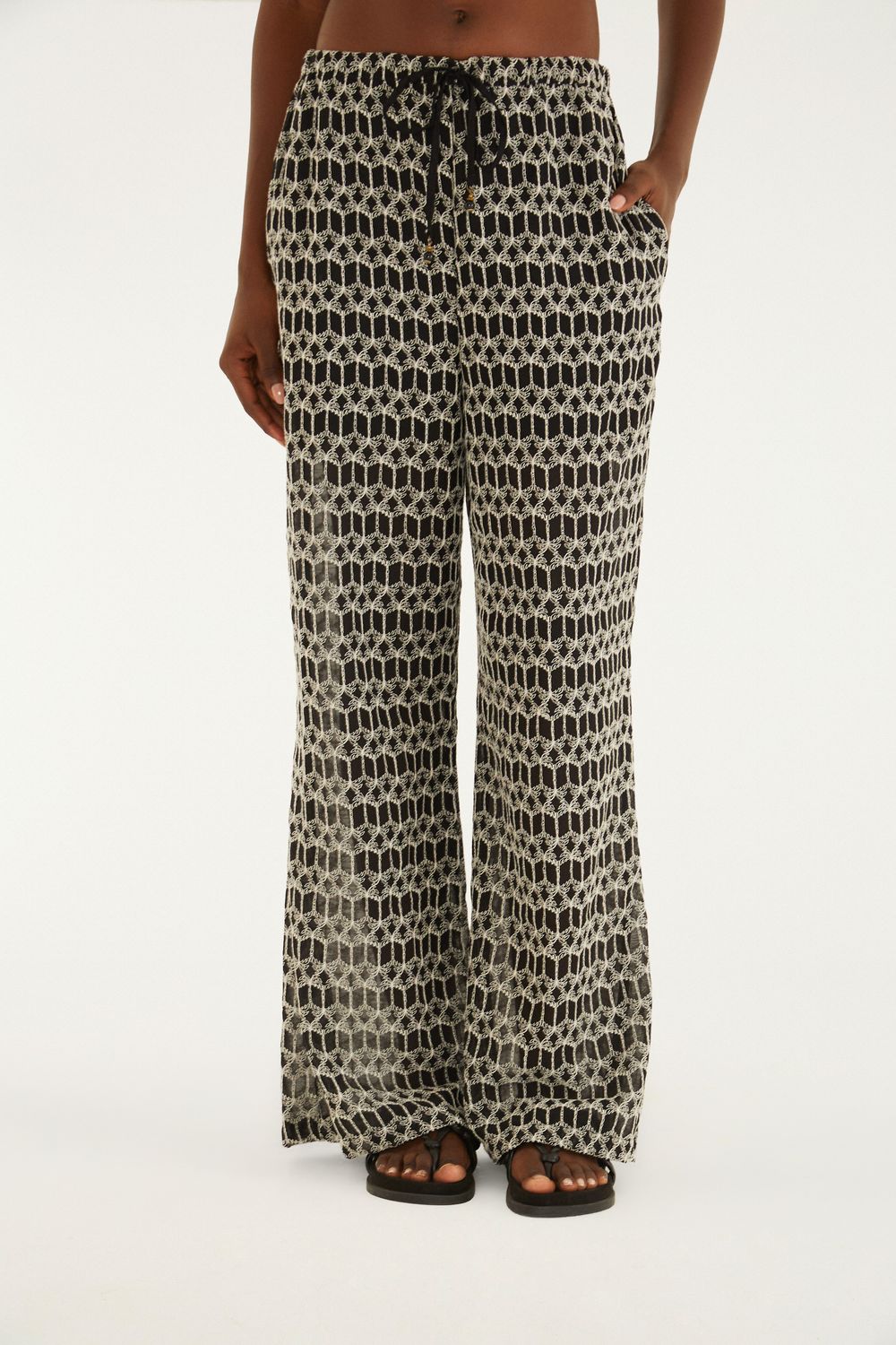 calça bordada coqueirinho. com cintura alta e modelagem ampla, traz bordados que conferem charme único à peça. o cós ajustável com cordão garante conforto, enquanto o tecido leve proporciona movimento e fluidez. complemento perfeito para momentos casuais e encontros especiais à beira-mar. FARM Rio, coleção Carioca - inverno 26.-