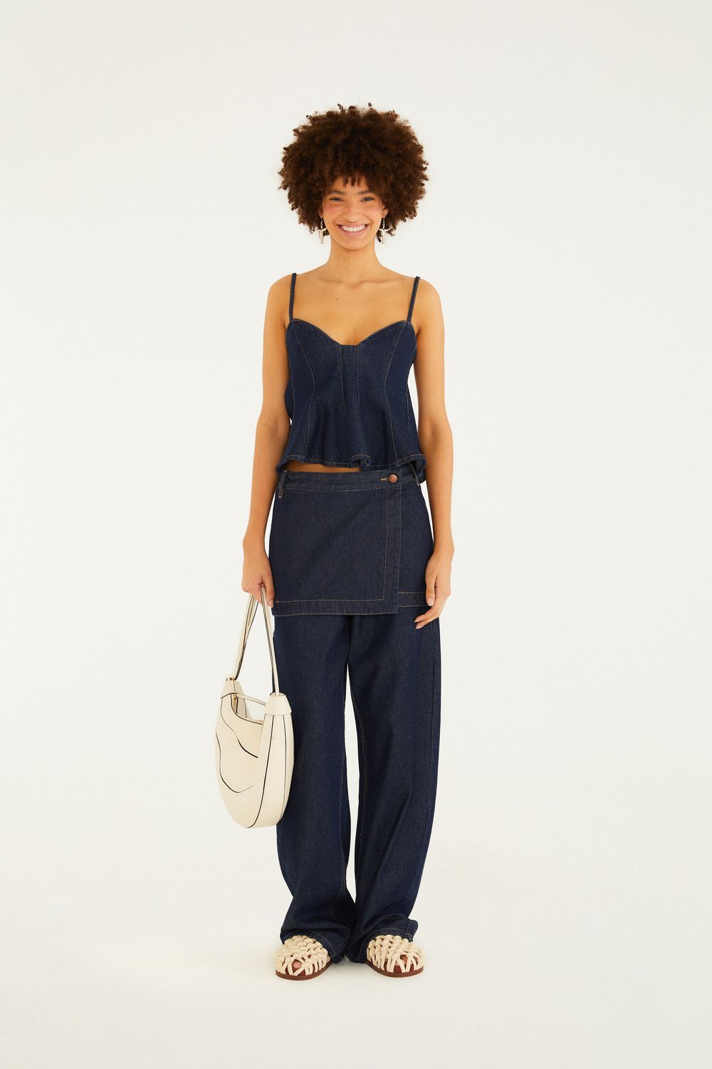 calça cintura média original jeans. modelagem ampla, proporcionando conforto e uma estética casual. detalhes de bolsos estratégicos e fechamento tradicional elevam o design atemporal. perfeita para encontros casuais ou um dia no escritório. versatilidade que se adapta a diversas ocasiões. FARM Rio, coleção Carioca - inverno 26.-