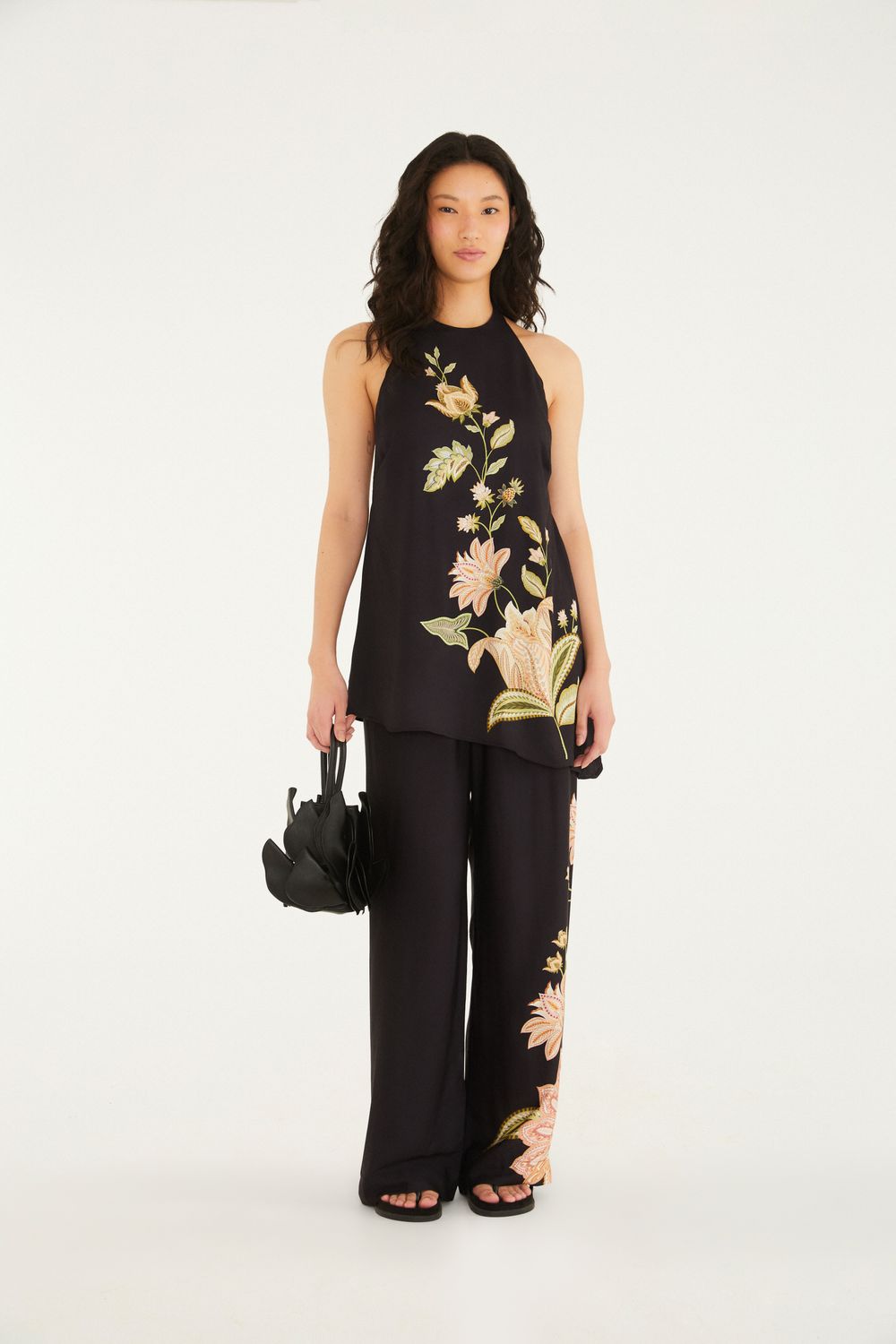 calca jamile traz a essência da leveza com seu caimento fluido e cintura elástica que garante conforto e praticidade. com corte reto e detalhes florais que percorrem a lateral, é perfeita para eventos casuais ou um passeio ao fim de tarde. uma peça versátil e original para elevar qualquer look. FARM Rio, coleção Carioca - inverno 26.-