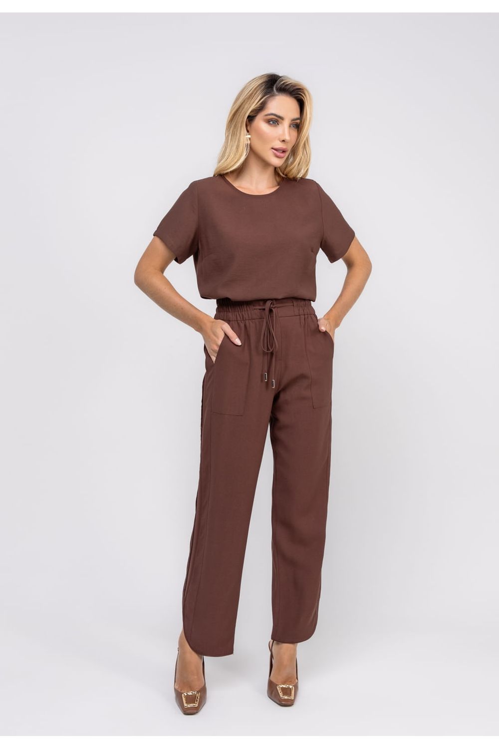 Calça Feminina Alfaiataria Barra Arredondada Marrom Salvatore