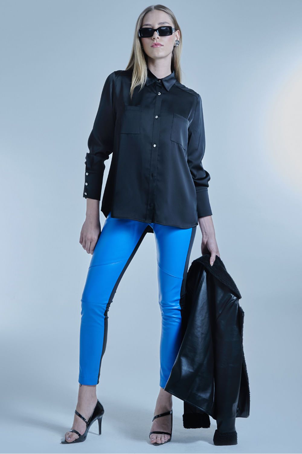 Uma calça de Couro PU bicolor é um tipo de calça feita de poliuretano que apresenta duas cores diferentes em seu design. Geralmente, essas calças têm uma cor predominante e outra cor em áreas específicas, como nas laterais, bolsos ou detalhes de zíper. As calças de Couro PU bicolor são consideradas peças de roupa elegantes e modernas, frequentemente usadas em eventos noturnos ou ocasiões formais. Elas podem ser combinadas com uma variedade de itens de vestuário, como camisas, blusas e blazers para criar um look sofisticado e fashion. Nossas peças acompanham as linhas do corpo com fluidez, leveza e conforto, abraçando todos os estilos valorizando a mulher. Aposte na Calça PU SMK para se sentir inKrível em qualquer ocasião todos os dias. Obs: Peça de PU é na verdade um laminado com um tipo de substrato (tecido ou não tecido), geralmente derivados de petróleo. Existem várias formas de fazer esse laminado. Normalmente eles são cobertos com materiais como o poliuretano (PU)-