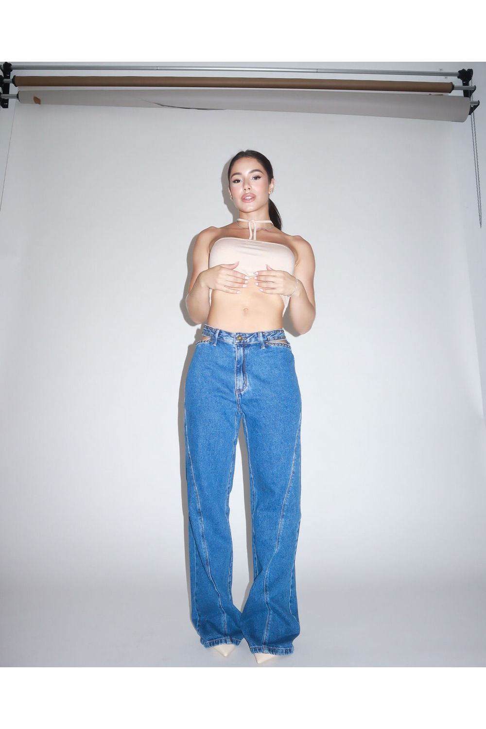 detalhes: Fechamento Por Botão e Ziper,Vazado Abaixo do Cós com Aplicação de Tachinhas ,Recorte Na Perna,Cintura Ajustada e Caimento Amplo Estilo Pantalona.