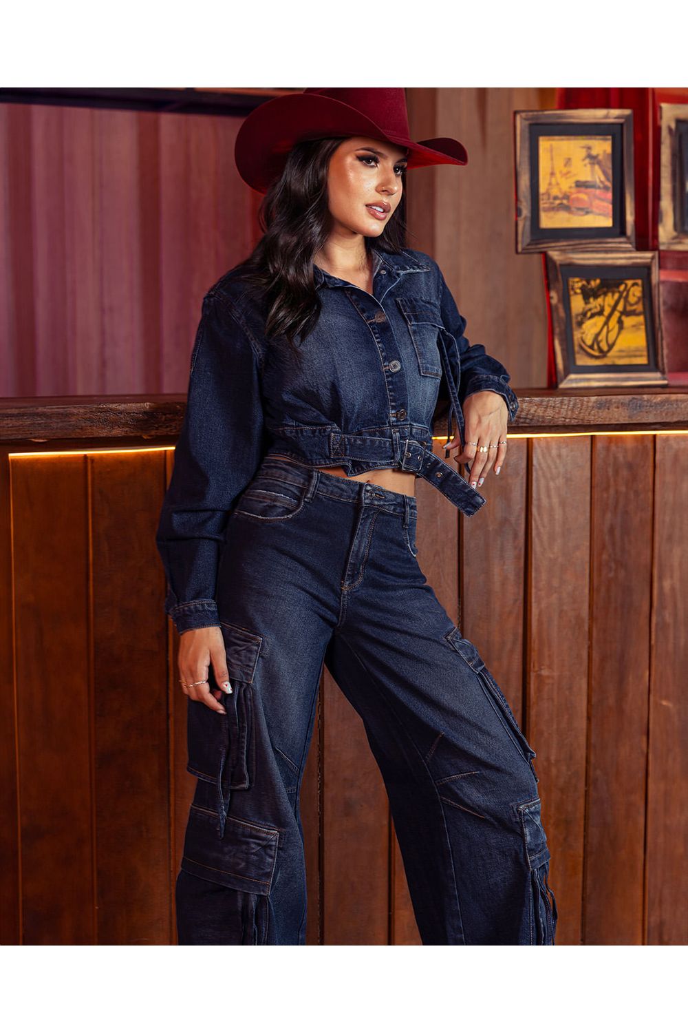 Calça Jeans Feminina Wide Leg Relaxed Cargo 24610 Escura