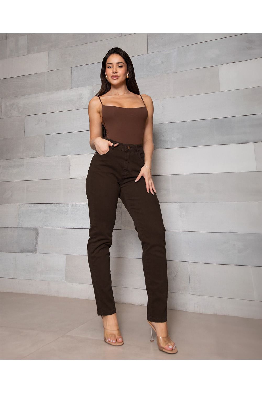 Calça Jeans Mom Feminina Cintura Alta Básica com Elastano 00201 Cafe