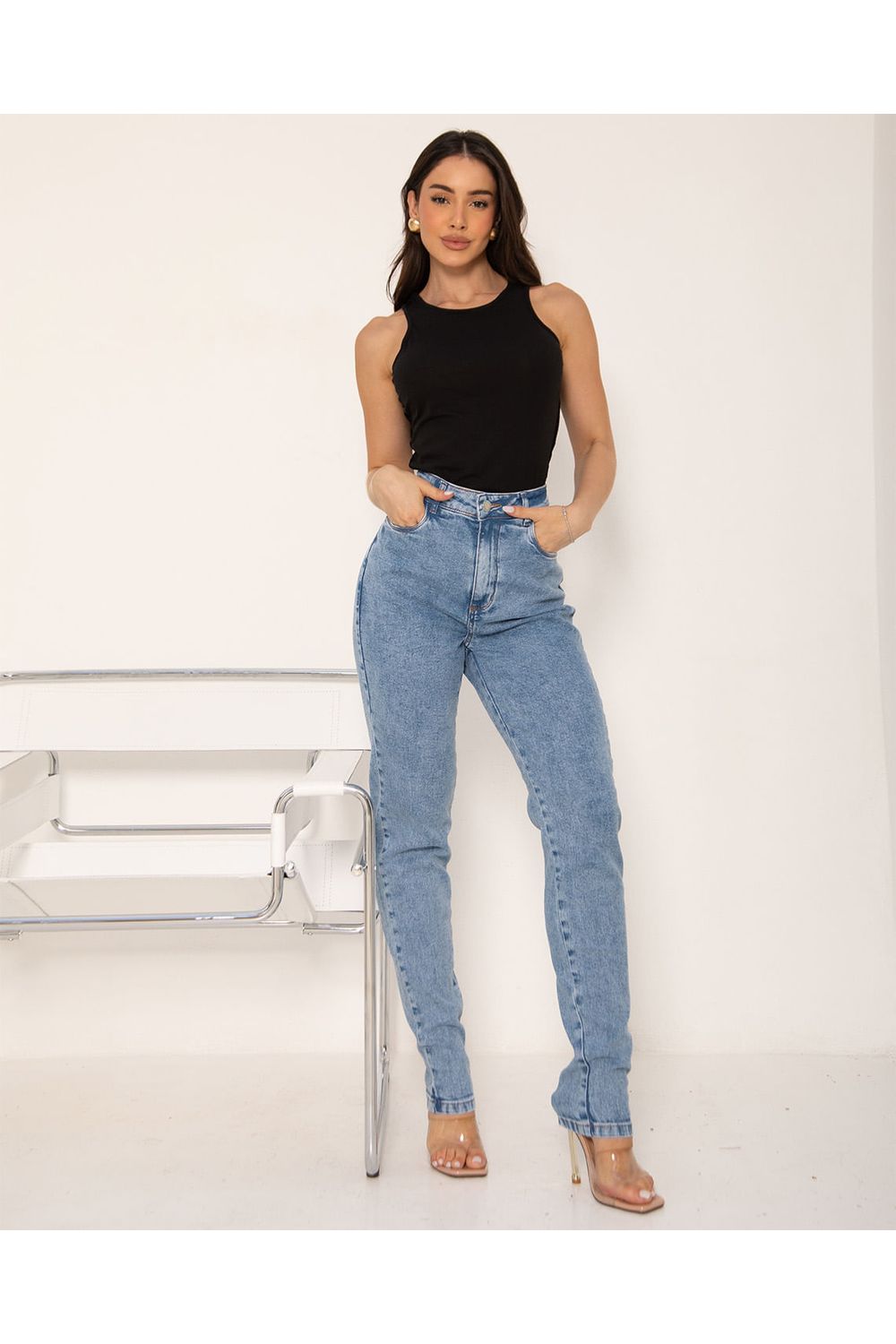 Calça Jeans Mom Feminina Cintura Alta Básica com Elastano 00201 Sky Claro