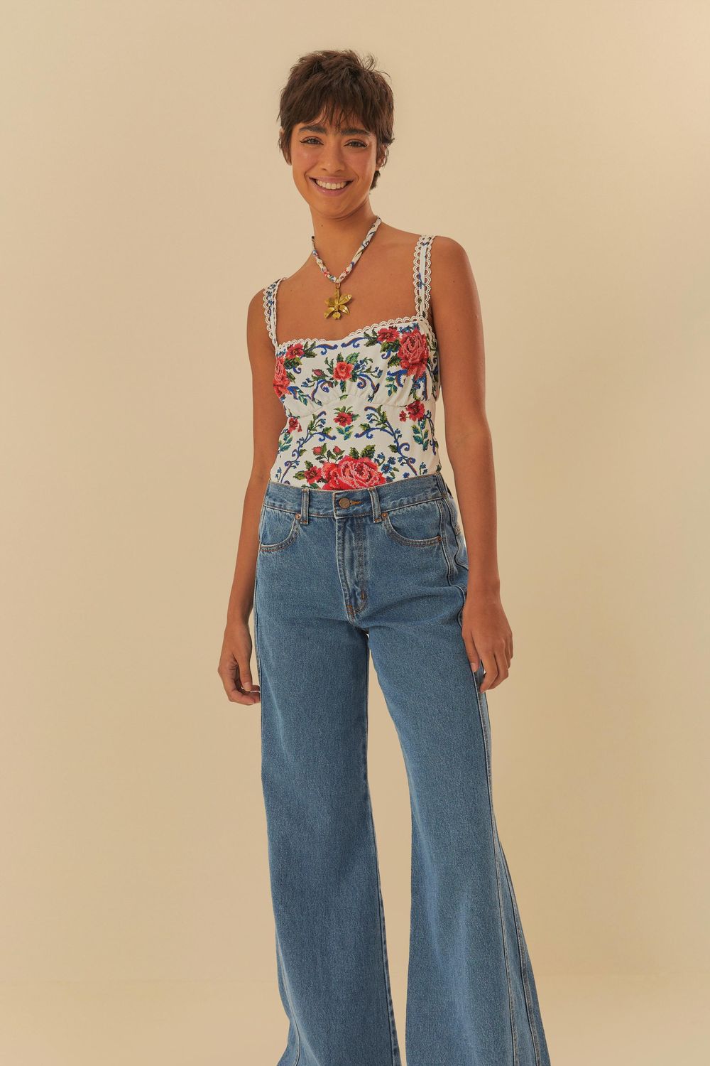 calça jeans recorte cós elástico. com um toque moderno e casual, esta peça oferece muito conforto com seu cós elástico, perfeito para diferentes corpos. os recortes trazem um ar contemporâneo, enquanto a modelagem ampla garante liberdade nos movimentos. ideal para usar em passeios diurnos ou encontros descontraídos à noite. a versatilidade do jeans azul permite combinações variadas, tornando-a um curinga no guarda-roupa. esta é uma peça exclusiva da coleção FARM RIO original - alto verão 25.-
