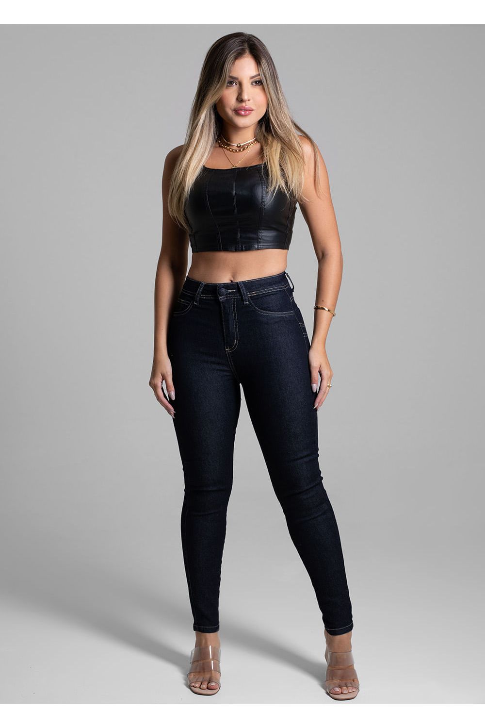 Calça levanta bumbum confeccionada em jeans. A modelagem tem quatro pences que valorizam as formas.