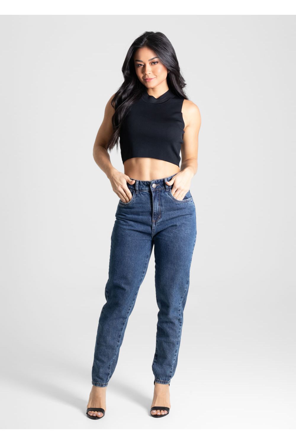Calça mom confeccionada em jeans. A modelagem mom tem um caimento soltinho nos quadris e coxas ajustando até o tornozelo. Cintura alta Fechamento com botão e zíper Bolsos frontais e bolsos traseiros funcionais Barra simples Modelagem: Mom Tecido: Jeans Tipo de lavagem: Azul Cor: Azul-
