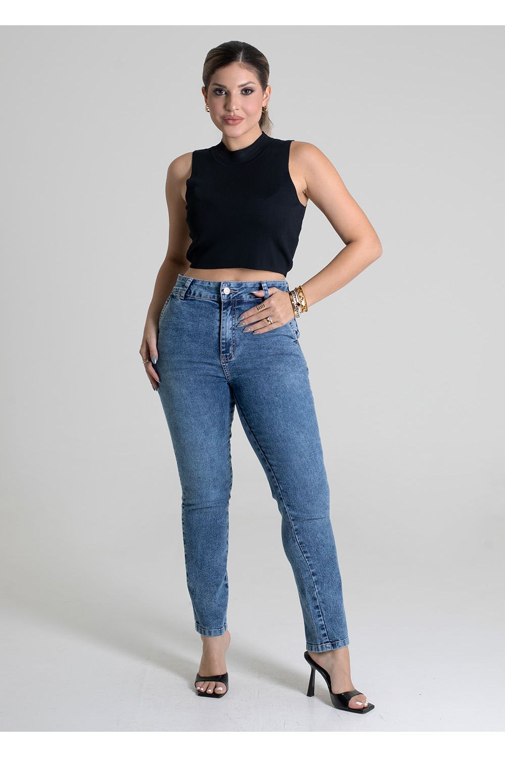 Calça jeans feminina de modelagem reta, com caimento mais solto ao corpo. Cintura alta Fechamento com botão e zíper Bolsos frontais falsos e bolsos traseiros funcionais Barra simples Tecido: Jeans Tipo de lavagem: Azul Cor: Azul médio-