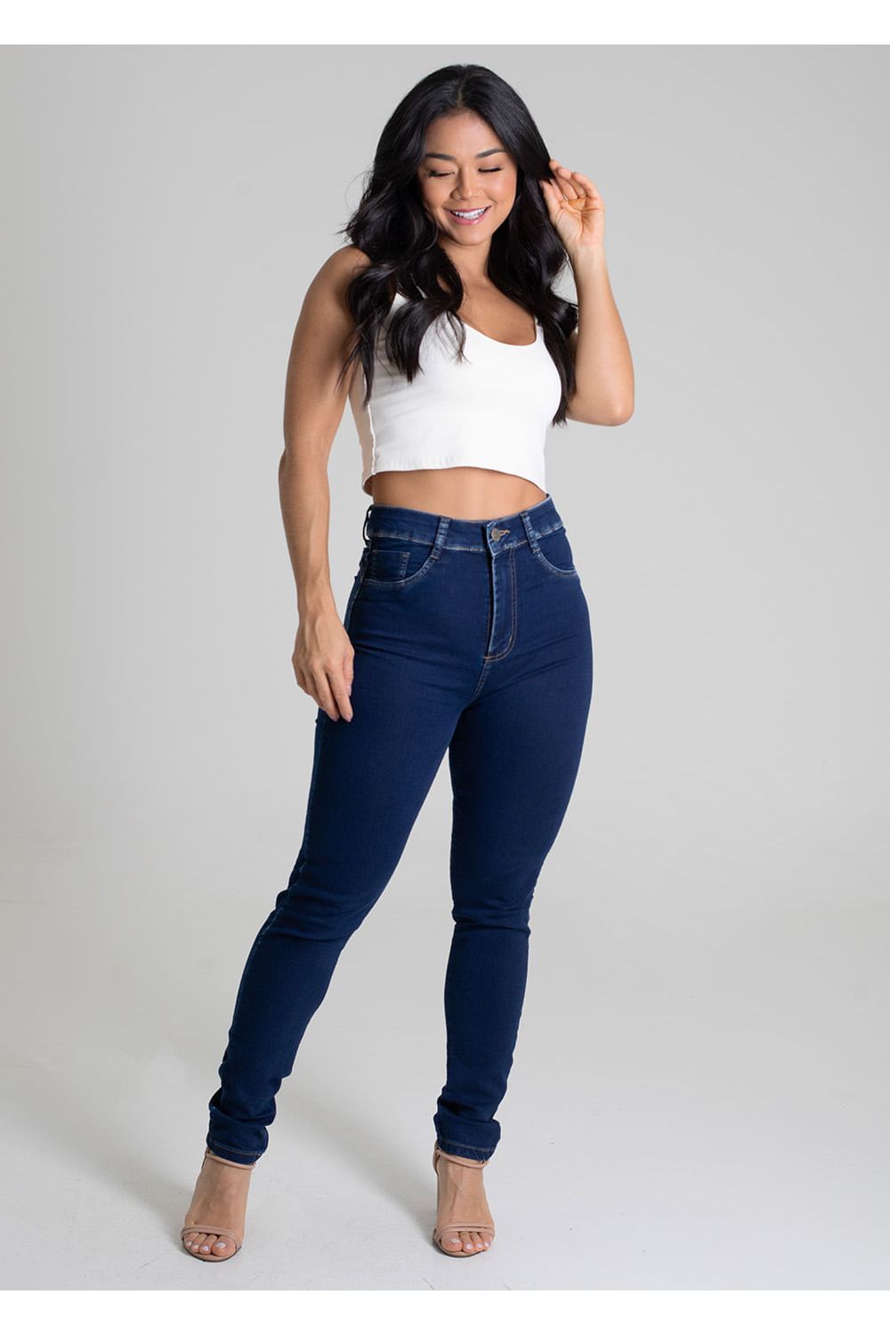 Calça feminina jeans skinny. A modelagem é skinny com caimento super ajustado ao corpo. Cintura média Fechamento com botão e zíper Bolsos frontais falsos e bolsos traseiros funcionais Barra simples Modelagem: Skinny Tecido: Jeans Tipo de lavagem: Azul Cor: Azul médio-