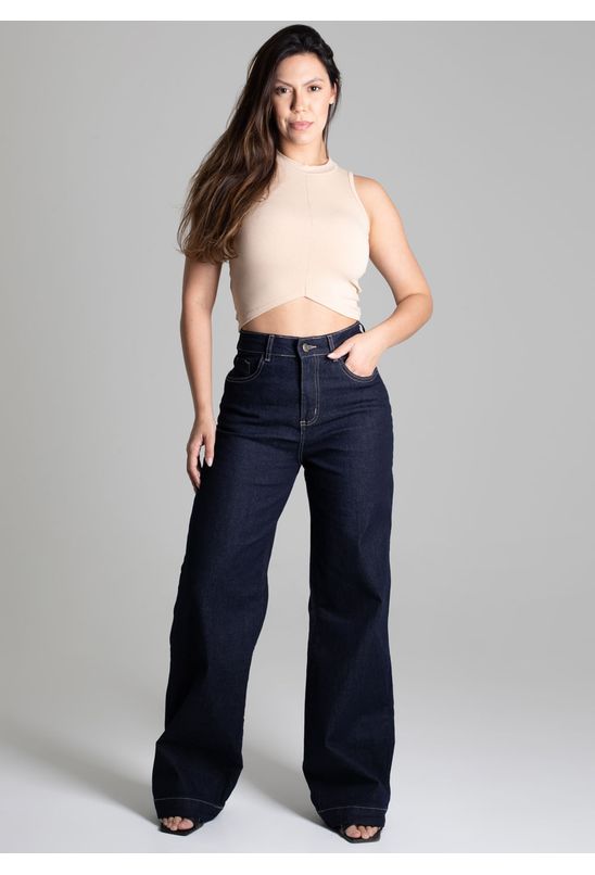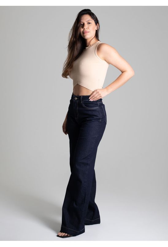 Calça feminina confeccionada em jeans. O modelo possui cintura super alta, gancho no lugar e caimento amplo da coxa até a barra.
