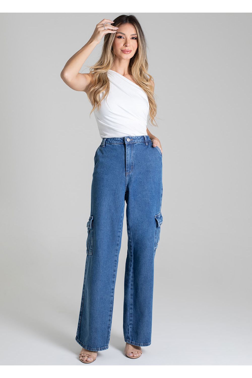 Calça feminina confeccionada em jeans. O modelo possui cintura super alta, gancho no lugar e caimento amplo da coxa até a barra. Cintura alta Fechamento através de um botão e zíper Bolsos Laterais ,Bolsos frontais e posteriores funcionais Barra simples Tecido: Jeans Tipo de Lavagem: Azul Cor: Azul médio-