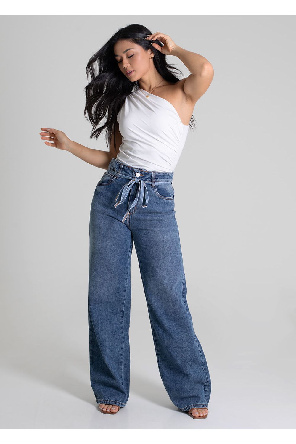 Calça feminina confeccionada em jeans. O modelo possui cintura super alta, gancho no lugar e caimento amplo da coxa até a barra. Cintura alta Fechamento através de um botão e zíper.cós acompanha um cordão com o mesmo tecido para amarração Bolsos frontais e posteriores funcionais Barra simples Tecido: Jeans Tipo de Lavagem: azul Cor: Azul-