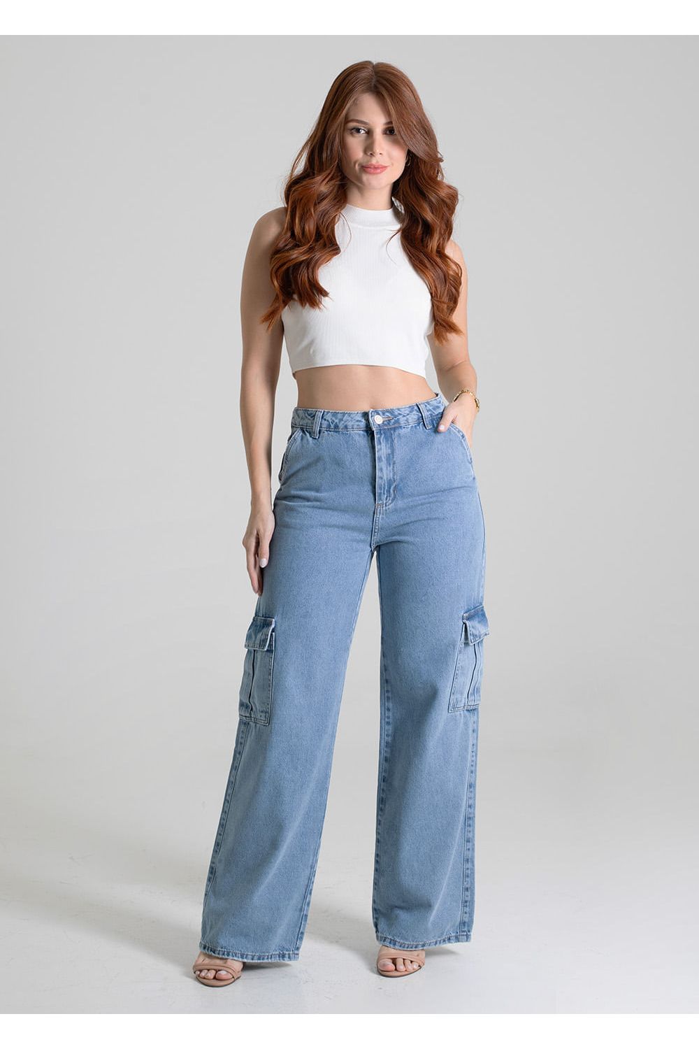 Calça feminina confeccionada em jeans. O modelo possui cintura super alta, gancho no lugar e caimento amplo da coxa até a barra. Cintura alta Fechamento através de um botão e zíper Bolsos frontais com leves puídos e posteriores funcionais Barra simples Tecido: Jeans Tipo de Lavagem: Azul Cor: Azul claro-
