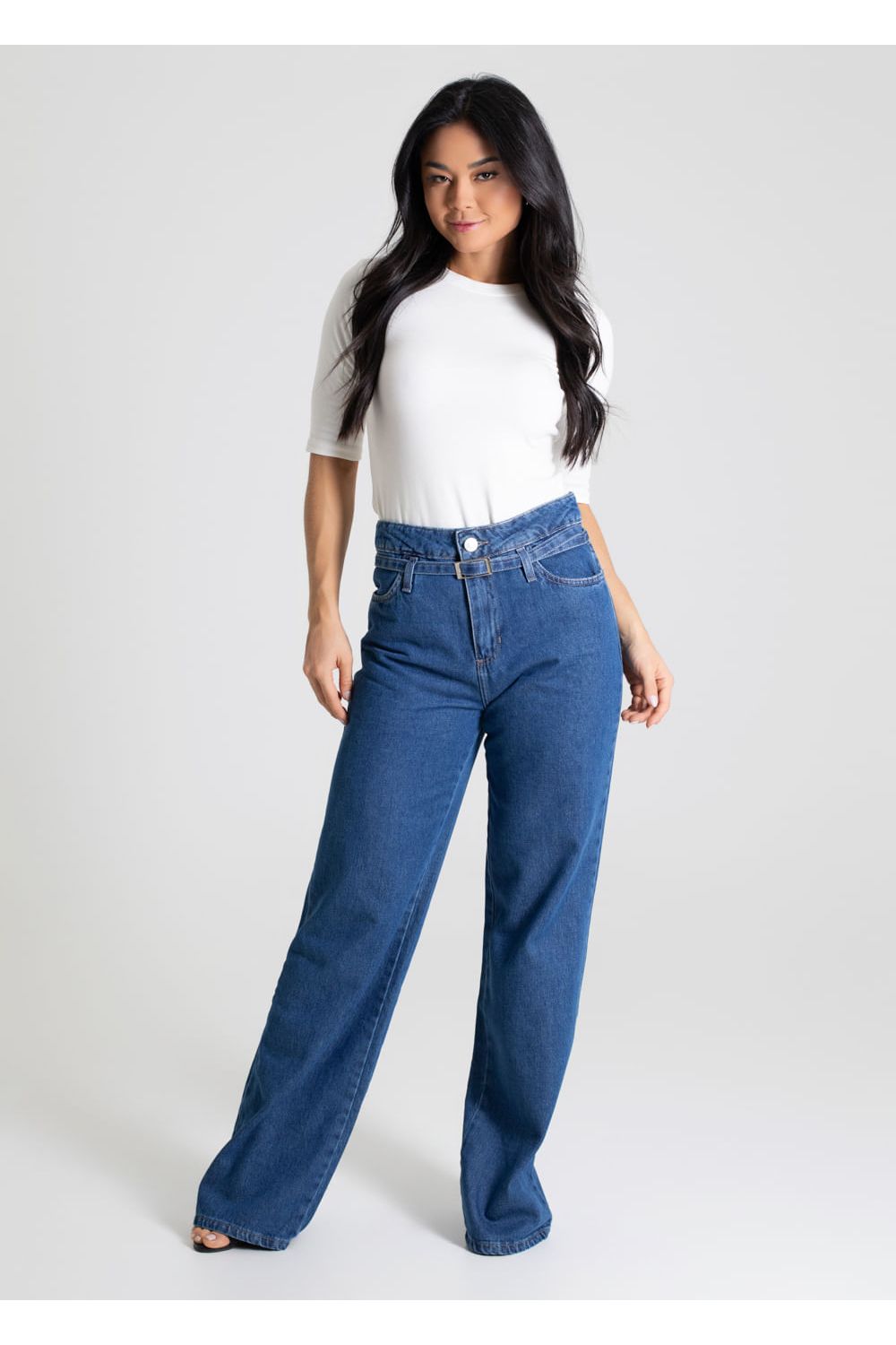 Calça feminina confeccionada em jeans. O modelo possui cintura super alta, gancho no lugar e caimento amplo da coxa até a barra. Cintura alta Fechamento através de um botão e zíper.cós acompanha um cordão com o mesmo tecido para amarração Bolsos frontais e posteriores funcionais Barra simples Tecido: Jeans Tipo de Lavagem: azul Cor: Azul medio-