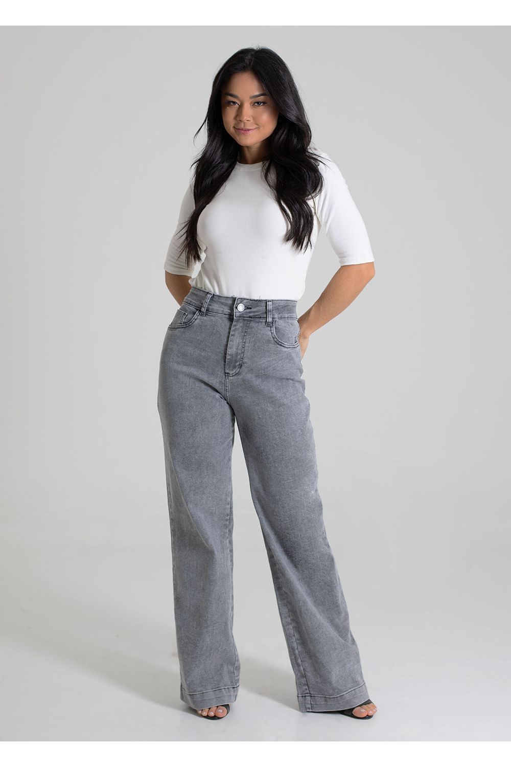 Calça feminina confeccionada em jeans. O modelo possui cintura super alta, gancho no lugar e caimento amplo da coxa até a barra. Cintura alta Fechamento através de um botão e zíper Bolsos frontais e posteriores funcionais Barra simples Tecido: Jeans Tipo de Lavagem: Marmorizada Cor: Cinza-