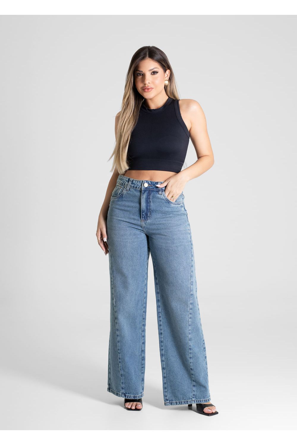 Calça feminina confeccionada em jeans. O modelo possui cintura super alta, gancho no lugar e caimento amplo da coxa até a barra. Cintura alta Fechamento através de um botão e zíper ,Bolsos frontais e posteriores funcionais Barra simples Tecido: Jeans Tipo de Lavagem: Azul Cor: Azul medio-