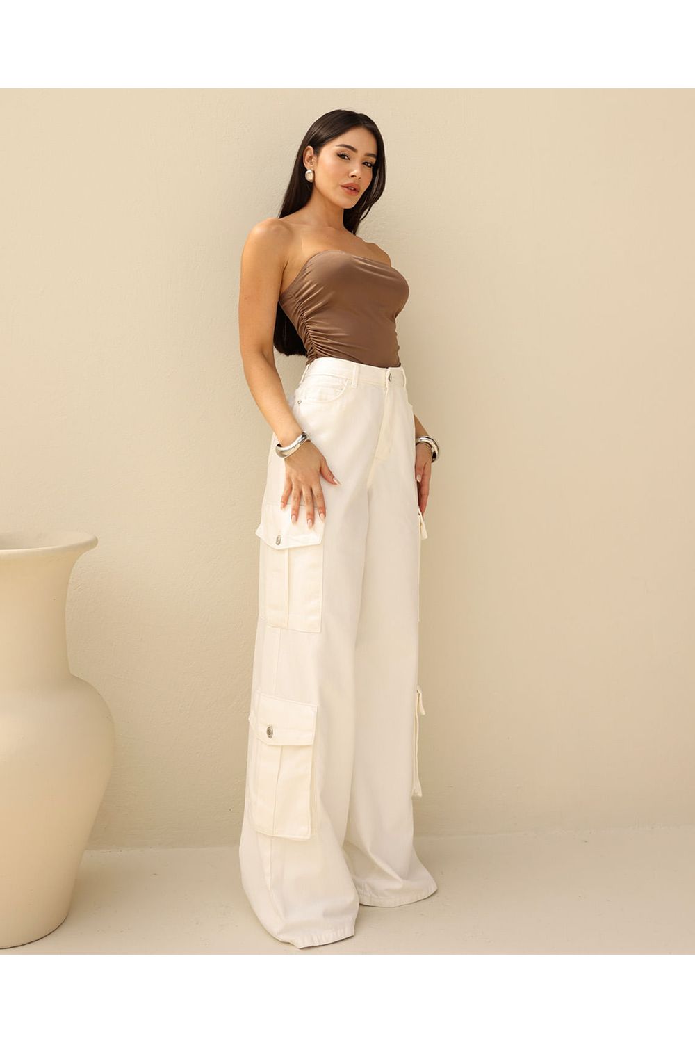 Calça Jeans Wide Leg Feminina Cargo 24729 Off White