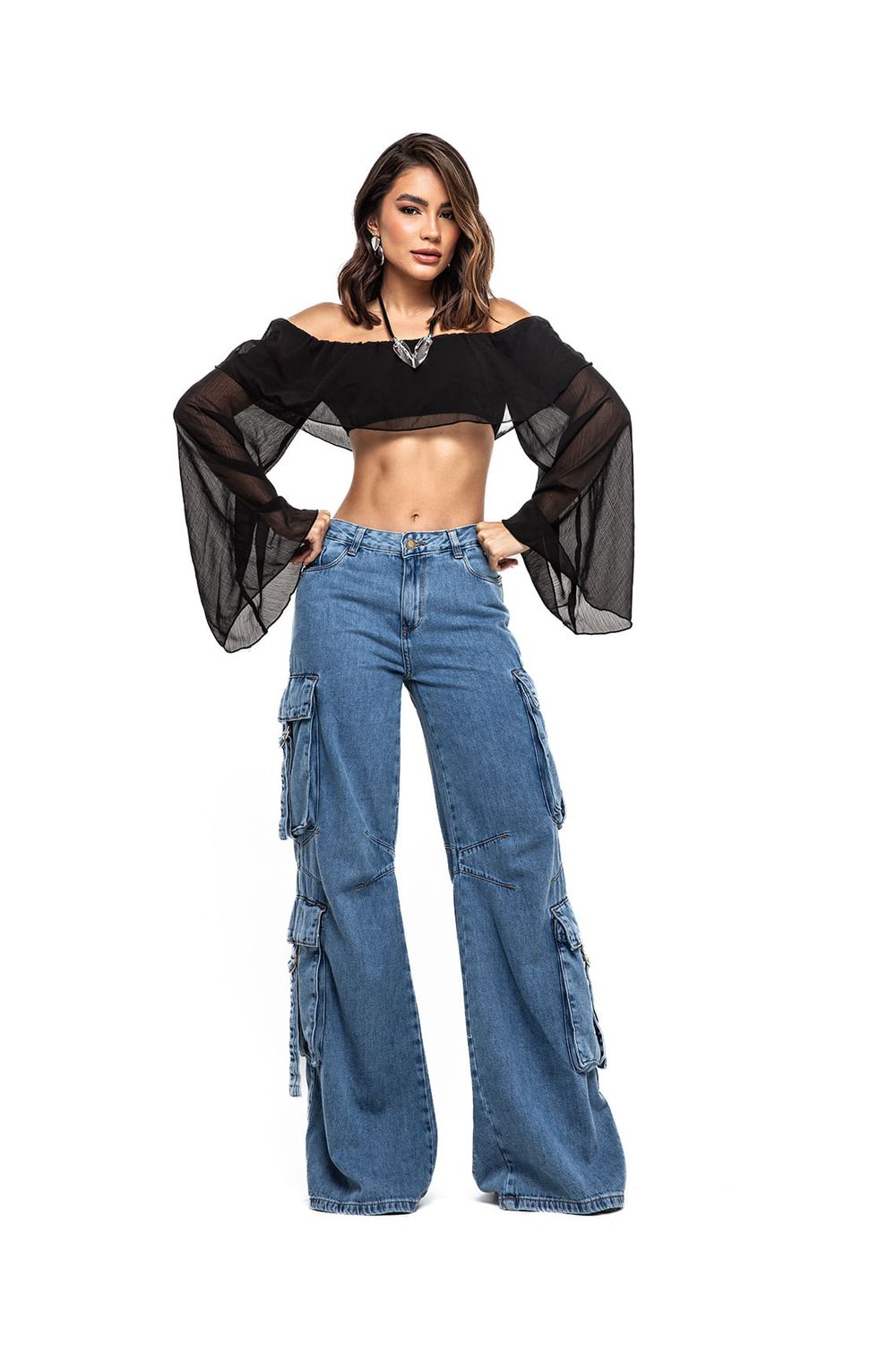 Calça Jeans Wide Leg Feminina Cargo Relaxed com Martigale Cintura Baixa 24528 Média