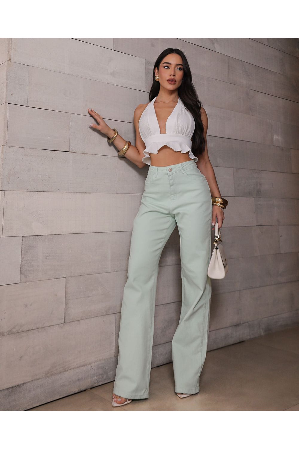 Calça Jeans Wide Leg Feminina Cintura Alta Básica com Elastano 28000 Verde Menta