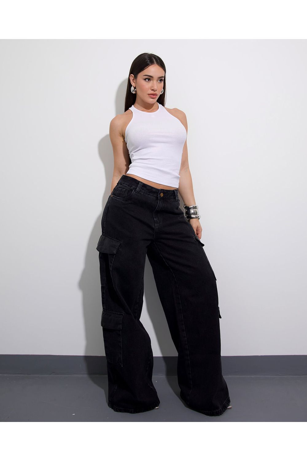 Calça Jeans Wide Leg Feminina Relaxed Cargo 24705 Vintage