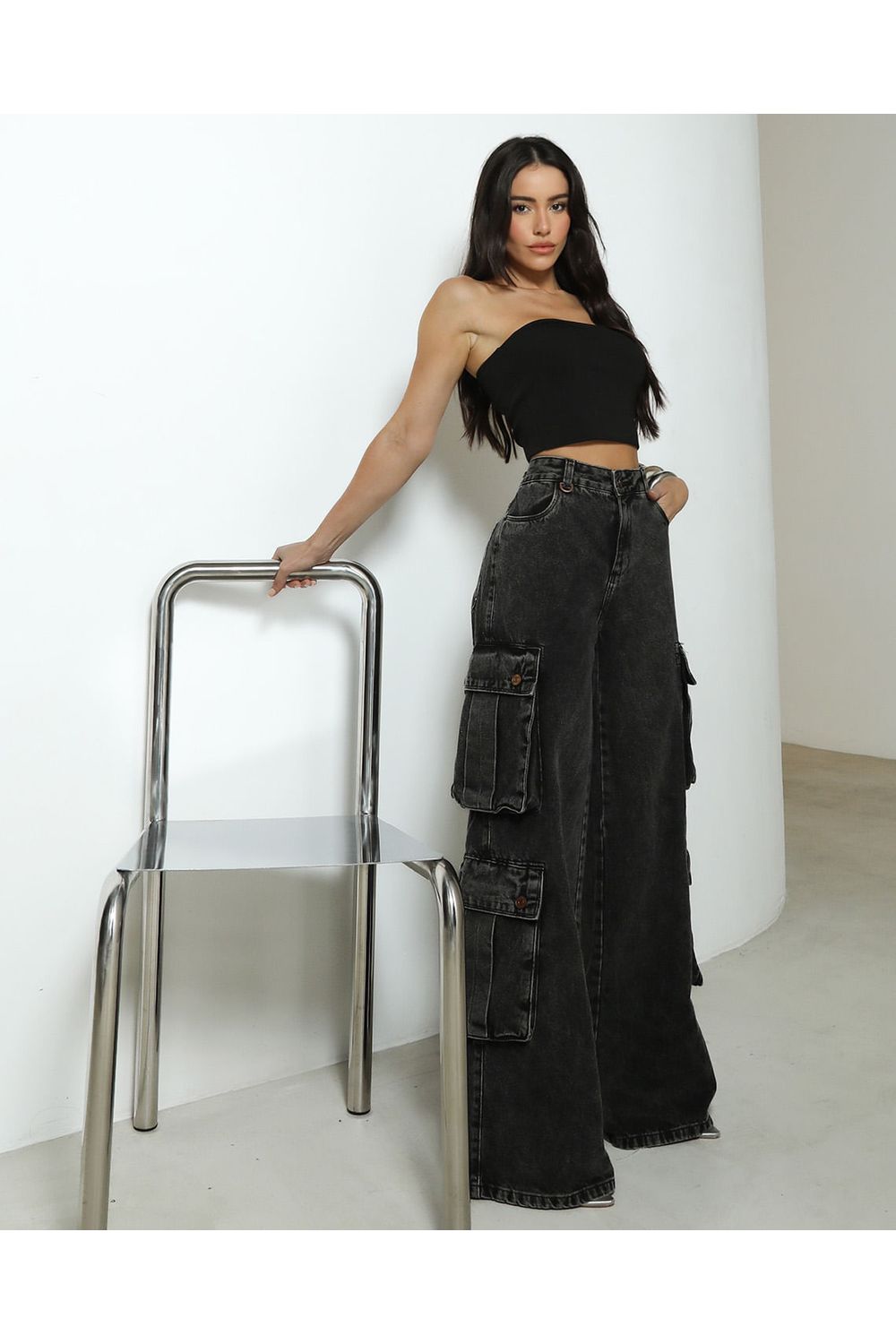 Calça Jeans Wide Leg Feminina Relaxed Cargo 24805 Vintage