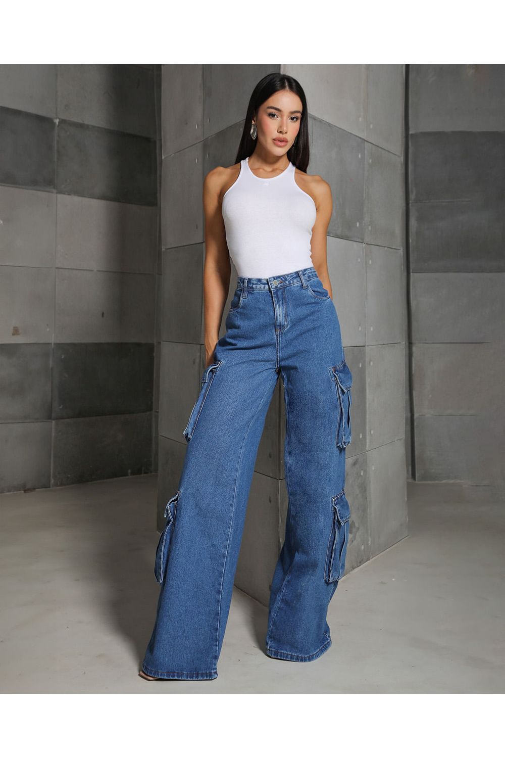 Calça Jeans Wide Leg Feminina Relaxed Cargo 24920 Sky Médio