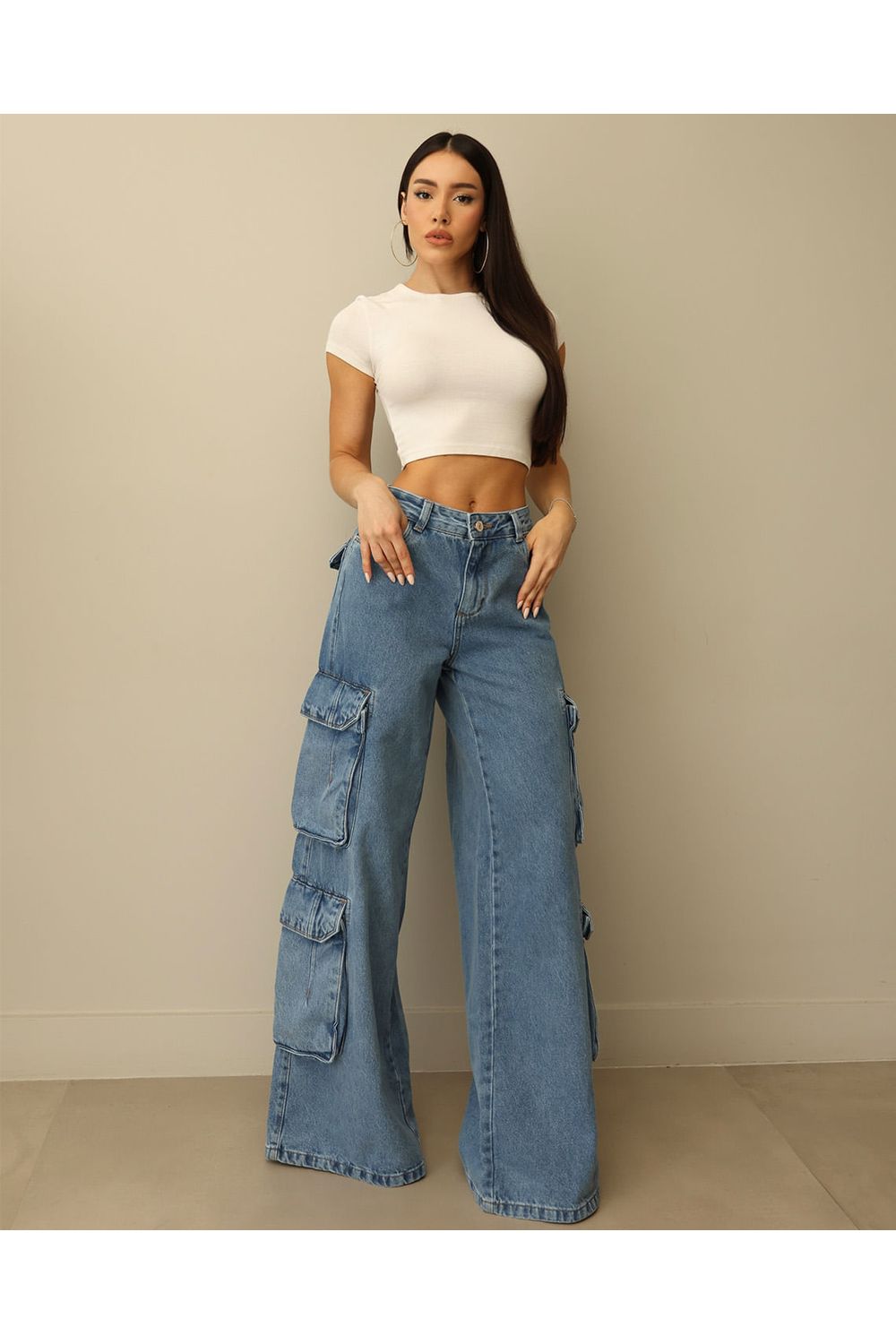 Calça Jeans Wide Leg Feminina Relaxed Cargo 24957 Sky Médio