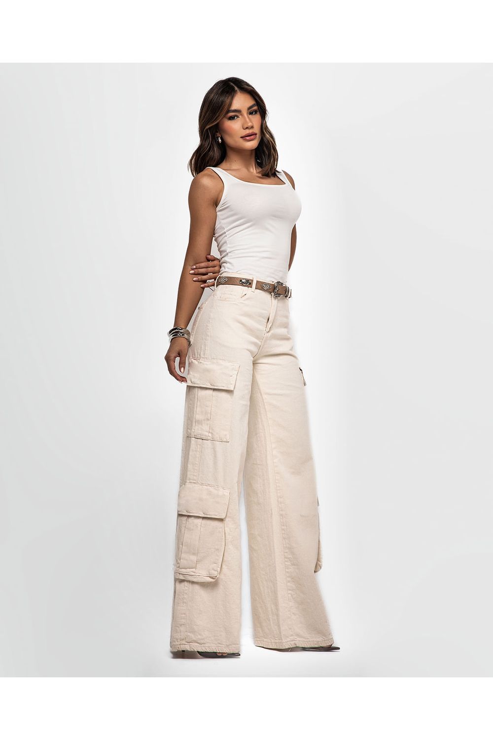 Calça Jeans Wide Leg Feminina Relaxed Cargo 25083 Off White