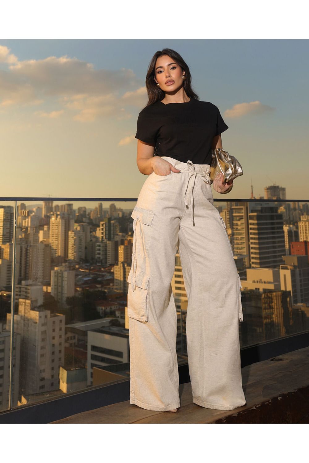Calça Linho Wide Leg Feminina Cargo 24653 Linho