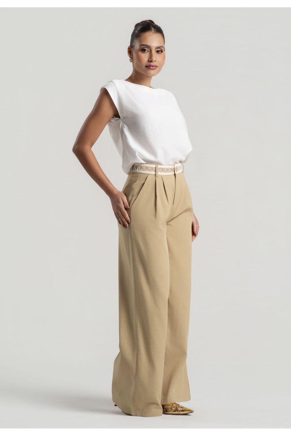 Calça Pantalona Alfaiataria Com Cinto de Renda Bege Salvatore